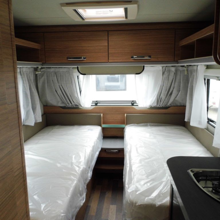 Fixed single beds to the front with overhead locker and open dhelving, under bed storage, dividing curtain.