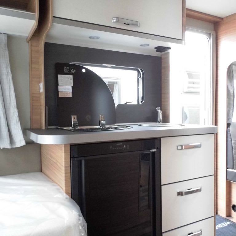Centre kitchen with 3 burner gas hob with glass lid, recessed sink, fridge and freezer, foldable worktop extension and ample storage.